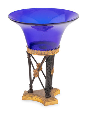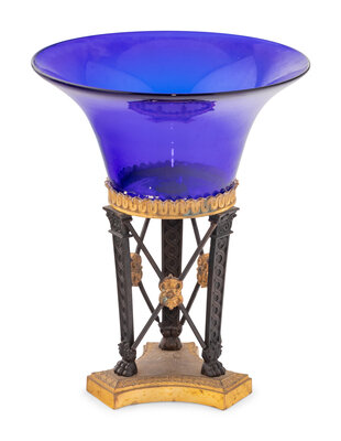 An Empire Style Gilt and Patinated Bronze and Cobalt Glass Centerpiece