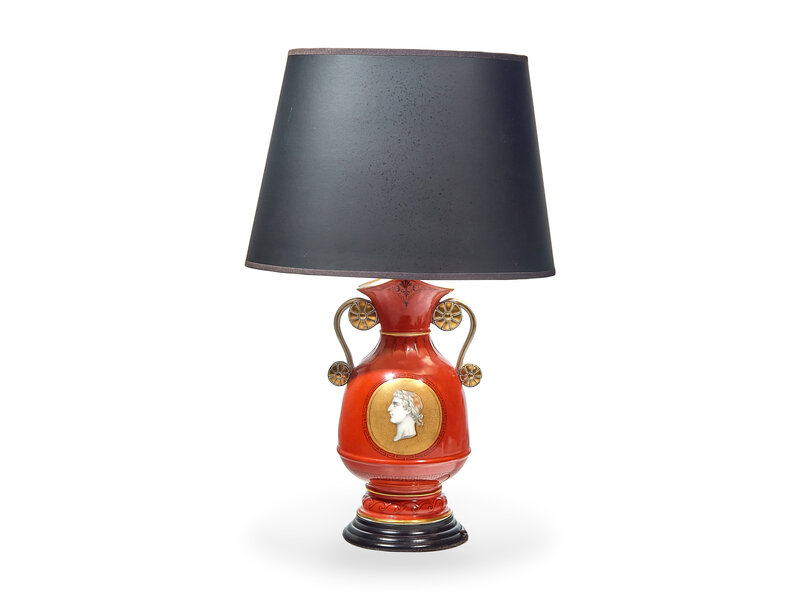 A Continental Parcel-Gilt Etruscan Decorated Porcelain Lamp