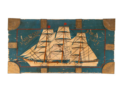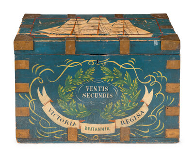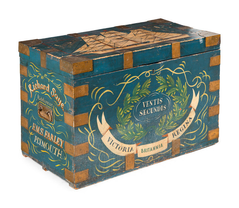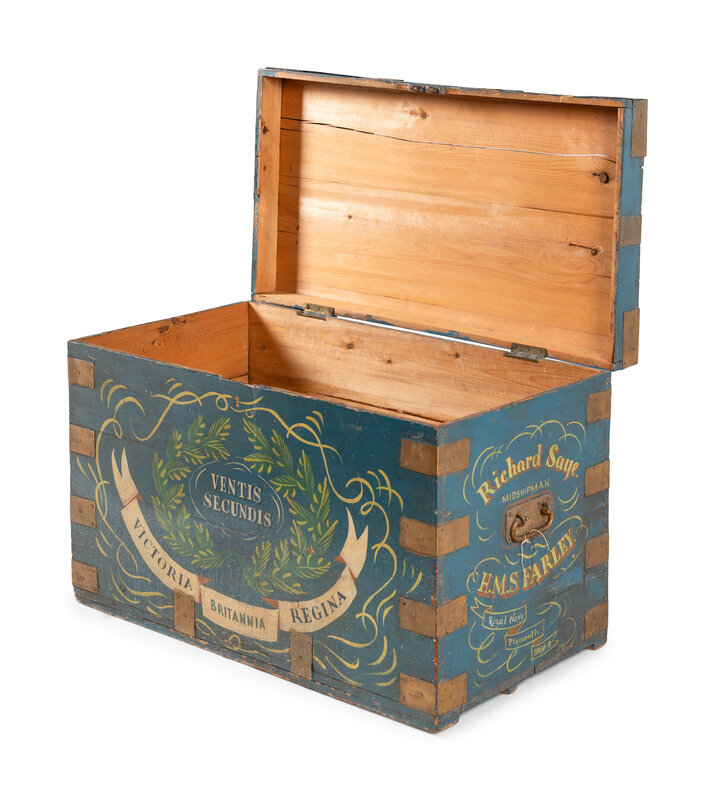the chest with painted inscription 'VENTIS SECUNDIS/ VICTORIA REGINA BRITANNIA' to the front and further inscribed 'Richard Saye/ Midshipman/ H.M.S. Farley/ Royal Navy / Plymouth/ 1886-9' to each side.
