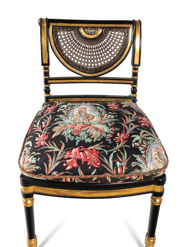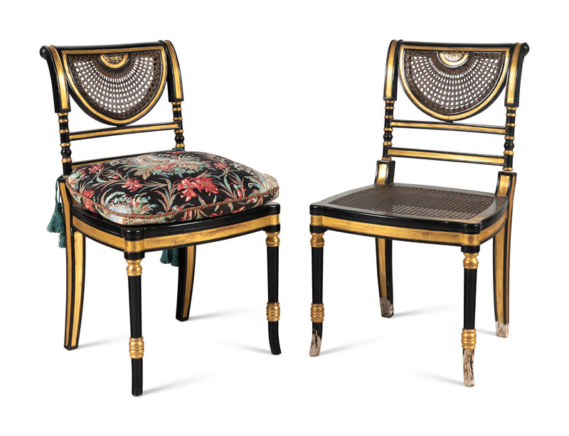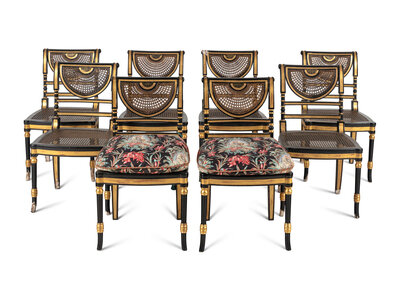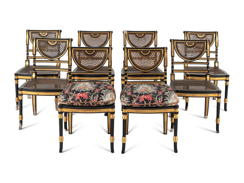 A Set of Eight Regency Style Black Painted and Parcel Gilt Dining Chairs