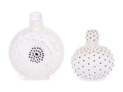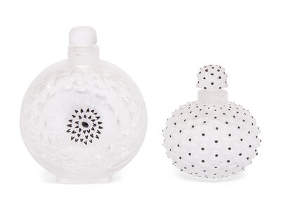 including one Cactus perfume bottle and one Dahlia perfume bottle, each signed 'Lalique France' on underside.