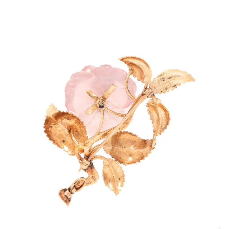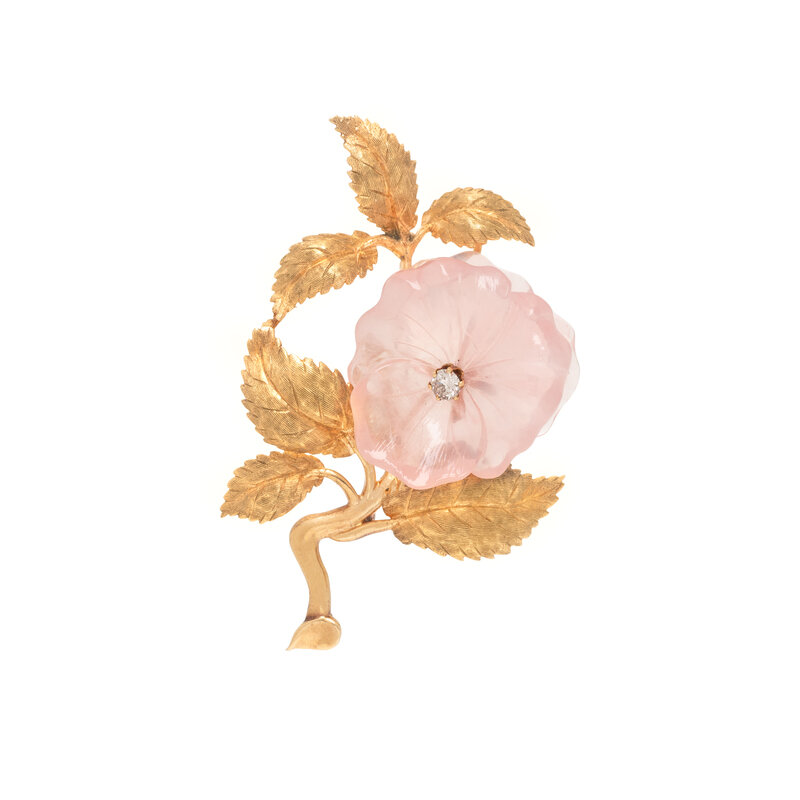 Carved rose quartz flower and round diamond weighing approximately 0.12 carat. Yellow gold. 2 1/4 x 1 1/2 inches.