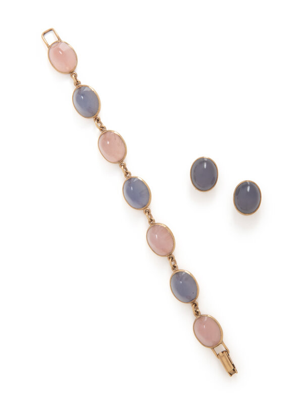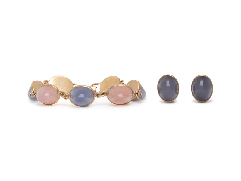 Including a bracelet containing rose quartz and blue chalcedony sugarloaf cabochons, and a pair of oval cabochon blue chalcedony earrings. 8 karat yellow gold. Bracelet: 7 inches long. Earrings: 5/8 inch long.