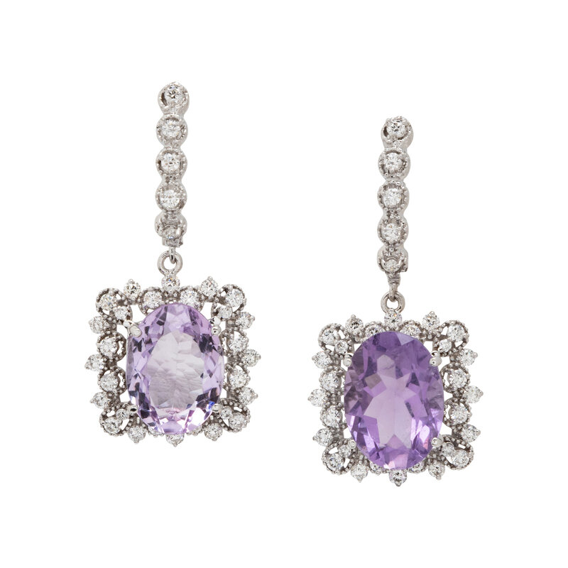Oval amethyst measuring approximately 14.00 x 10.00 mm, and round diamonds weighing approximately 1.75 carats total. White gold. 1 3/8 inches long.