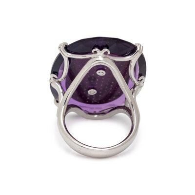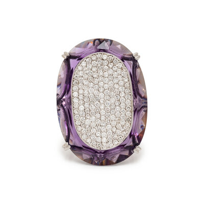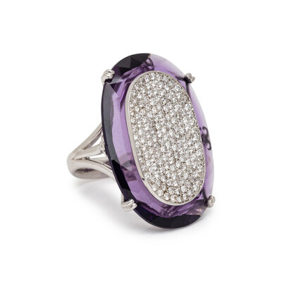Round diamonds weighing approximately 1.50 carat total and oval amethyst measuring approximately 35.00 x 25.00 mm. 14 karat white gold. Ring size 7.