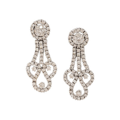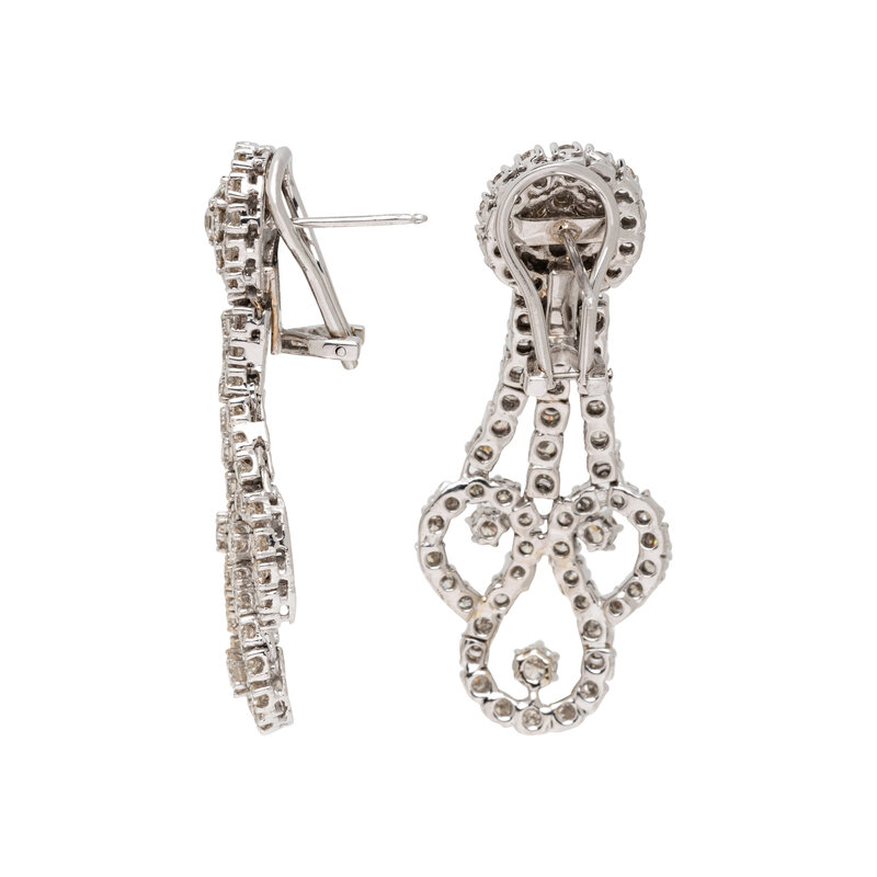 Round diamonds weighing approximately 5.00 carats total. 14 karat white gold. 1 7/8 inches long.