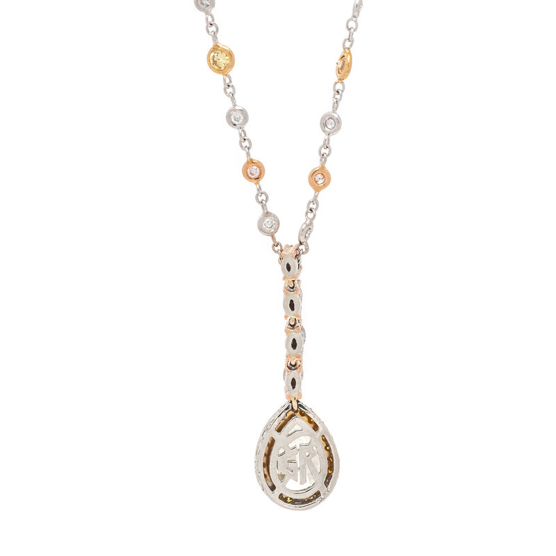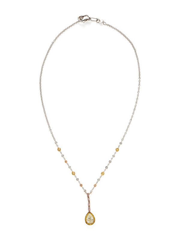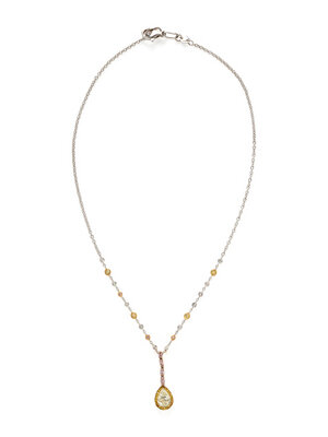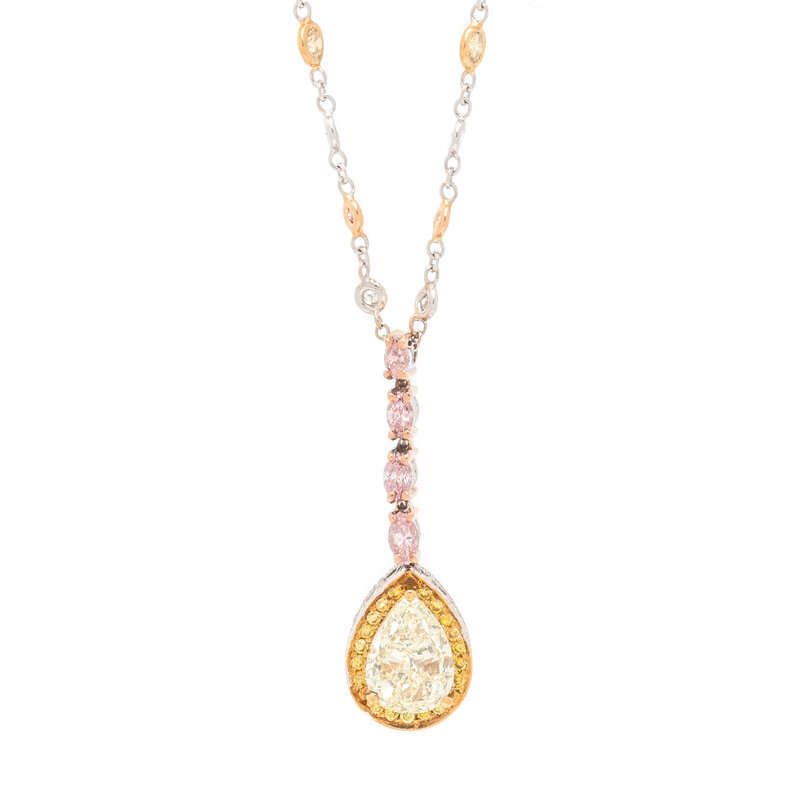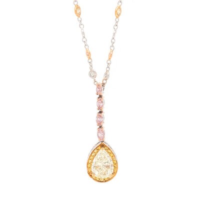 Pear shaped yellow diamond measuring approximately 9.65 x 6.80 mm, round diamonds, yellow diamonds and pink diamonds, and marquise cut pink diamonds (origin of colored diamonds not tested). 18 karat yellow, white, and rose gold, and platinum. Chain: 16 1/2 inches long. Pendant: 1 1/4 inches long.