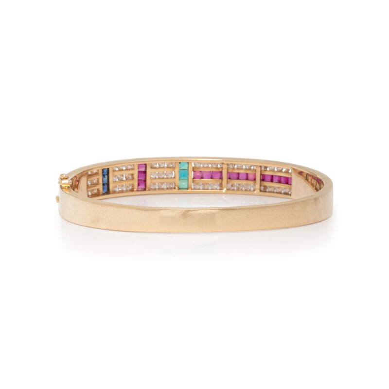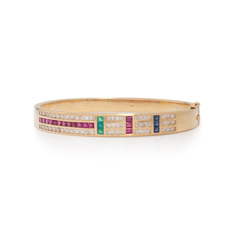 Square step cut rubies, sapphires, and emeralds, and round diamonds weighing approximately 1.50 carats total, hinged with side clasp. 14 karat yellow gold. 6 1/2 inches inner circumference.