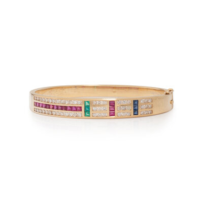RUBY, SAPPHIRE, EMERALD, AND DIAMOND BANGLE BRACELET