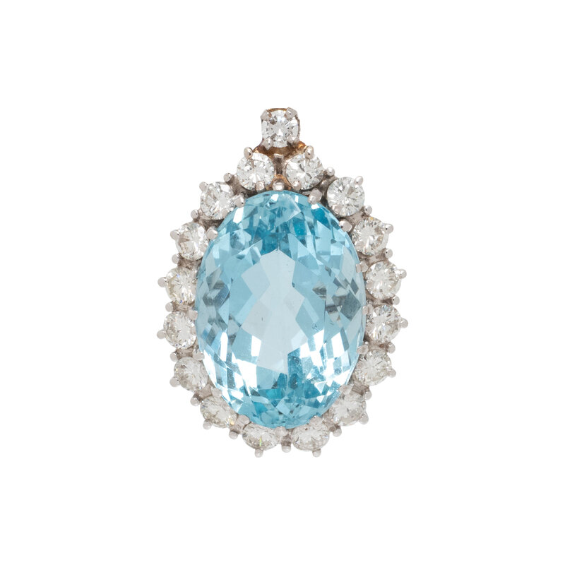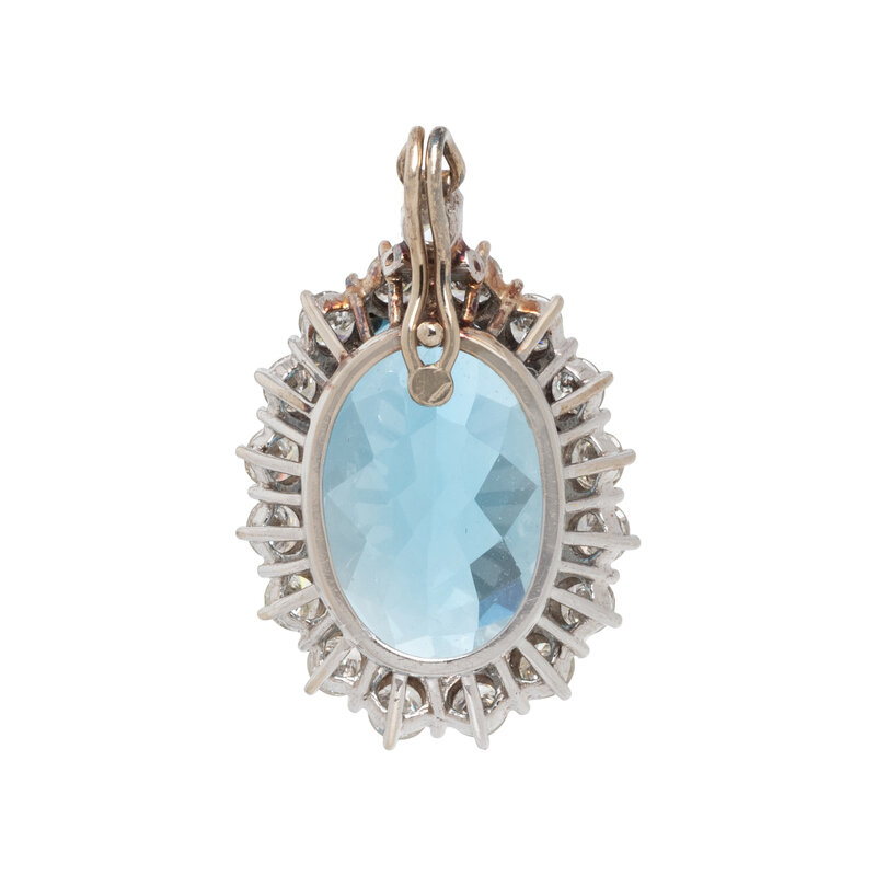 Oval aquamarine weighing approximately 12.00 carats by formula, and round diamonds weighing approximately 1.30 carats total. White gold. 1 inch long.