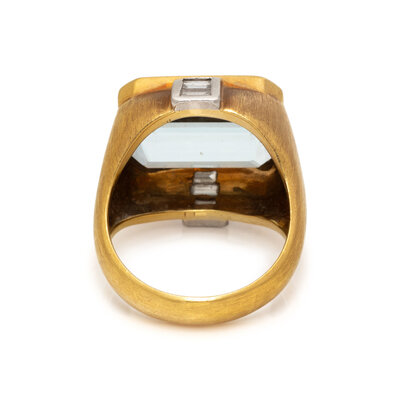 Emerald cut aquamarine weighing approximately 8.00 carats by formula, and baguette cut diamonds. 18 karat yellow gold and platinum. Ring size 8 3/4.