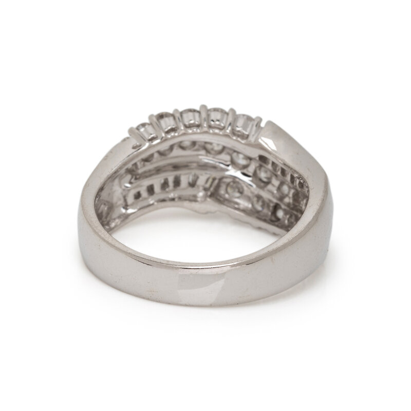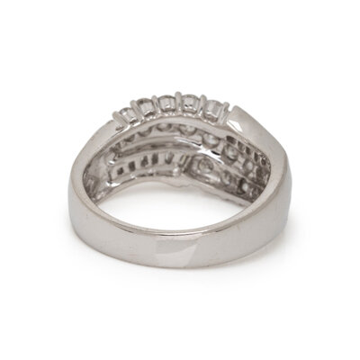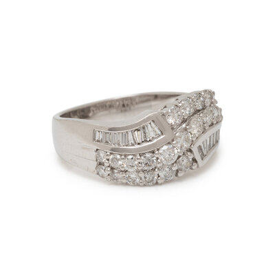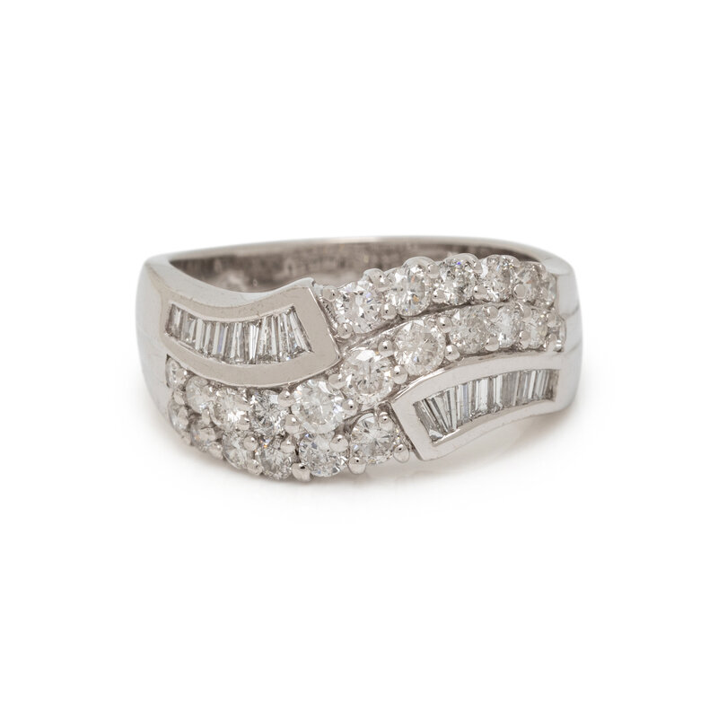 Round and tapered baguette cut diamonds weighing approximately 1.25 carats total. 14 karat white gold. Ring size 7.