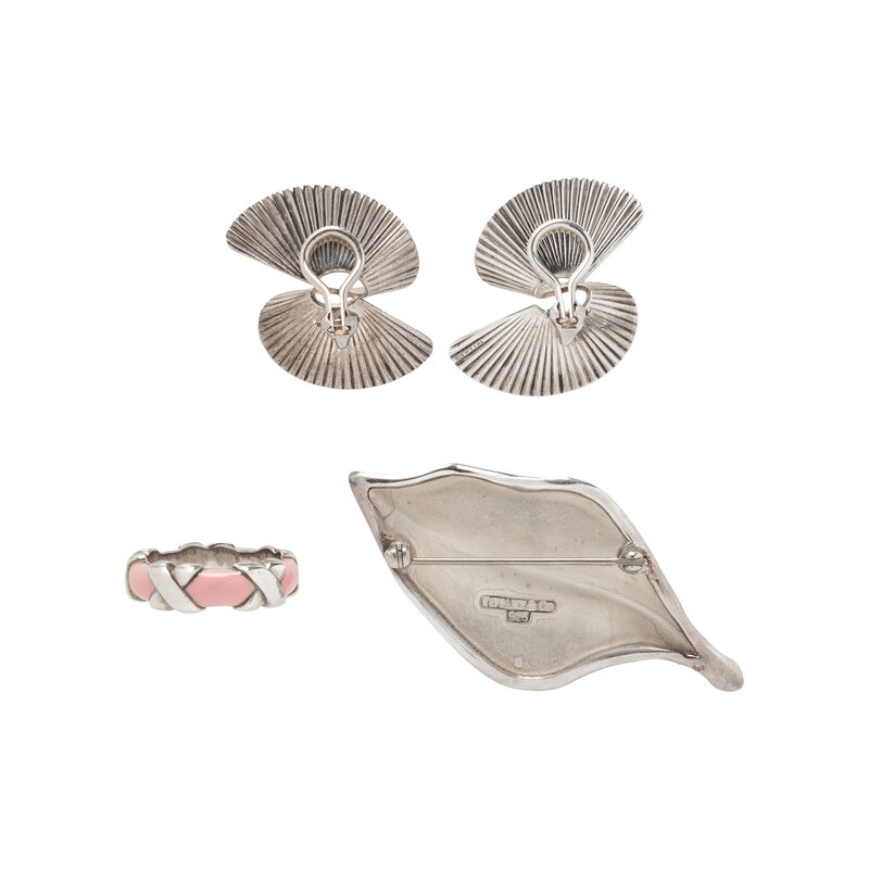 Including a pair of earrings, a brooch, and a pink enameled ring. Sterling silver. Earrings: 1 1/4 inches long. Brooch: 2 1/4 x 1 1/8 inches. Ring size: 6.