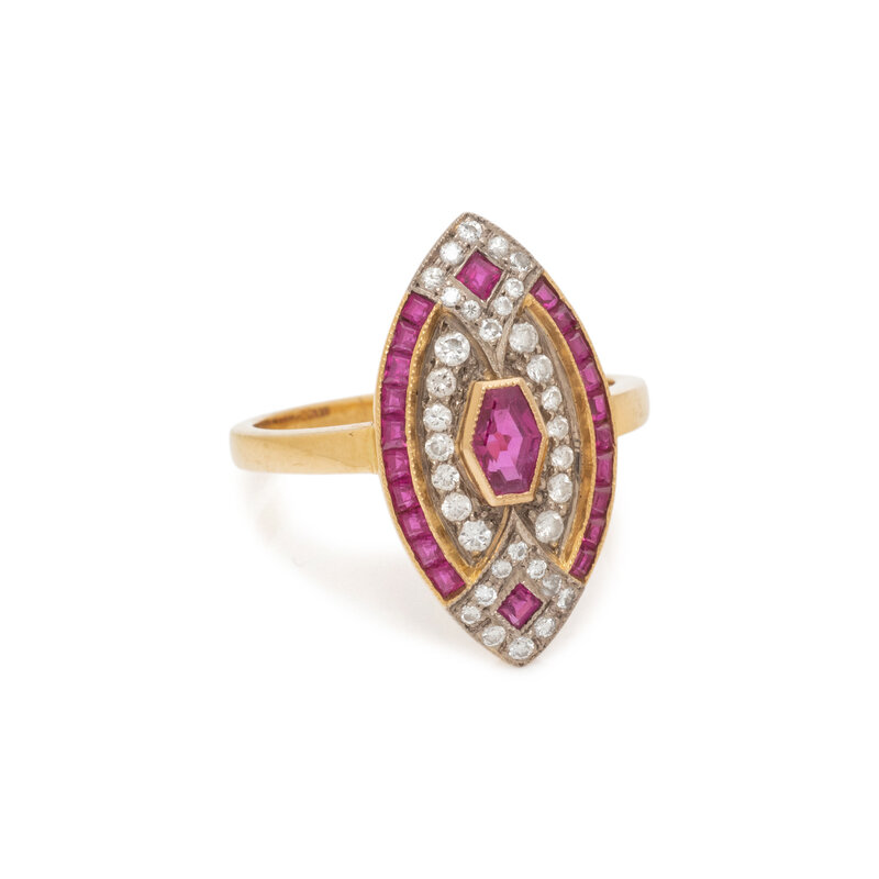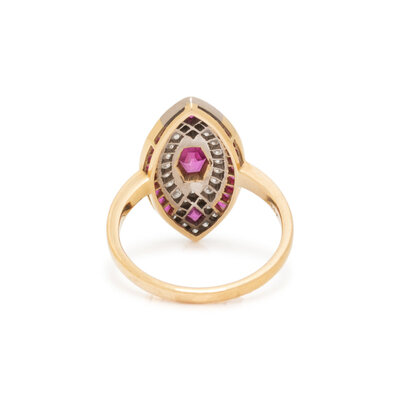 Hexagonal and square rubies and round diamonds. 18 karat yellow gold. Ring size 7.