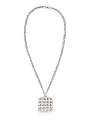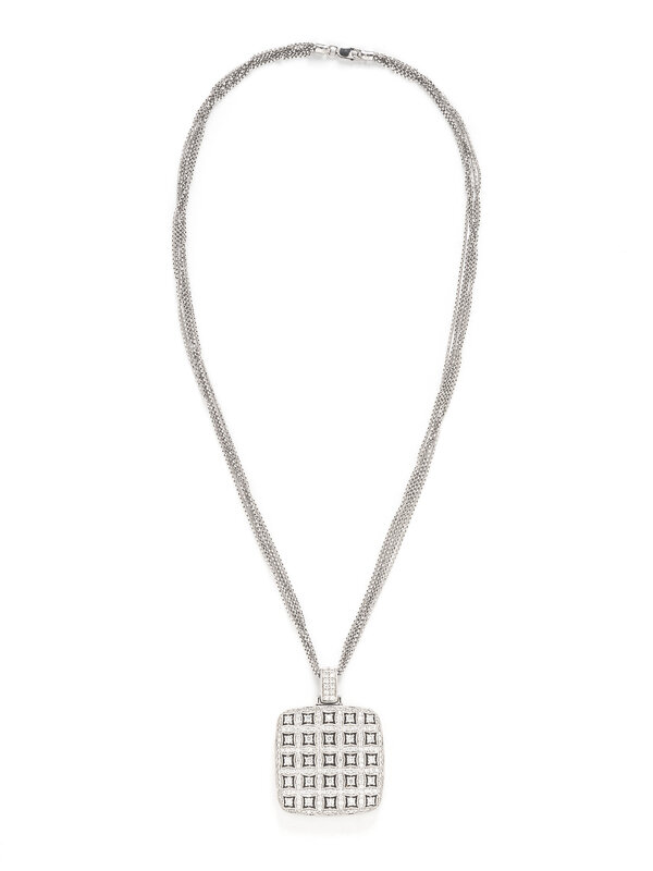 Round diamonds weighing approximately 3.00 carats total. 18 karat white gold. Chain: 17 inches long. Pendant: 1 5/8 inches long.