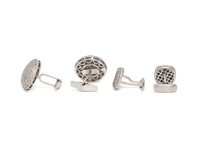 Including a round pair set with round diamonds weighing approximately 3.00 - 5.00 carats total, and a square pair set with round diamonds weighing approximately 1.50 carats total. 14 karat and 18 karat white gold. 7/8 inch wide and 9/16 inch wide.