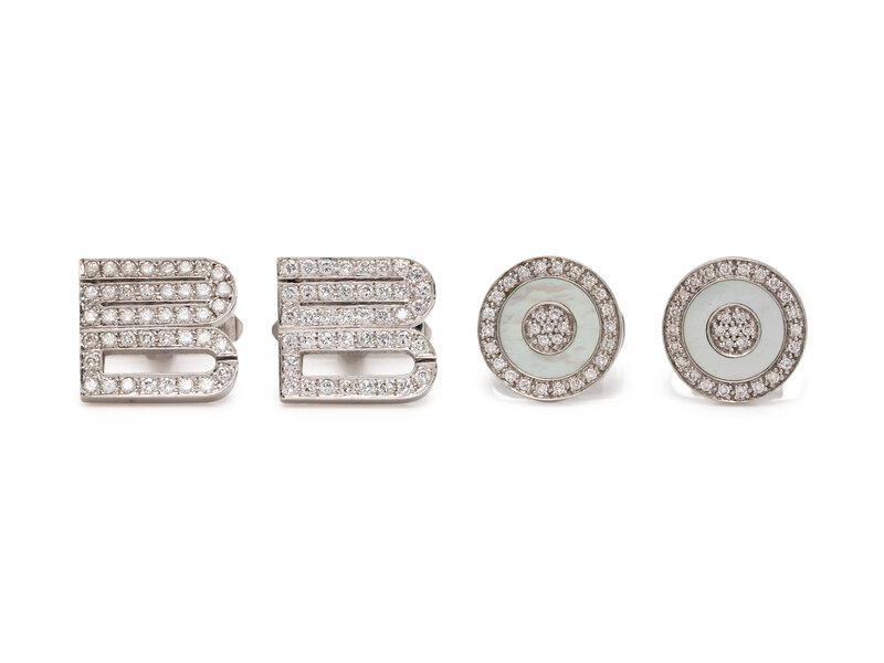 Two sets of cufflinks, one set with round diamonds weighing approximately 3.00 carats total, one set with mother-of-pearl and round diamonds weighing approximately 0.75 carat total. White gold. 5/8 x 5/8 inch; 5/8 inch wide.