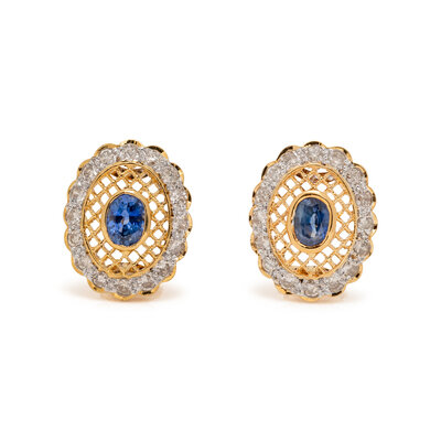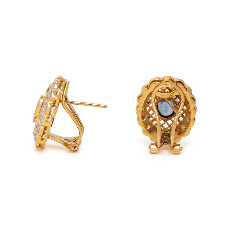 Oval sapphires measuring approximately 6.00 x 4.00 mm, and round diamonds weighing approximately 1.25 carats total. 18 karat yellow and white gold. 3/4 inch long.
