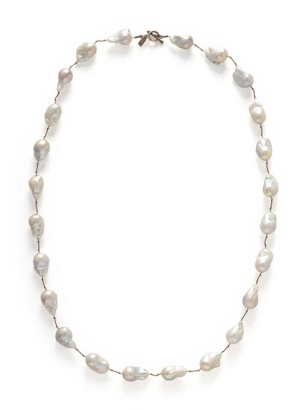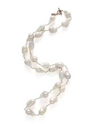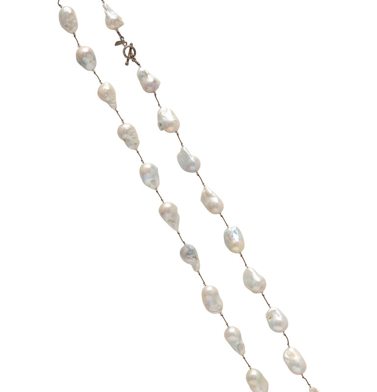Baroque cultured pearls measuring approximately 23.00 x 16.00 mm and rock crystal quartz beads, with sterling silver clasp. 36 inches long.