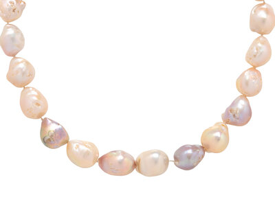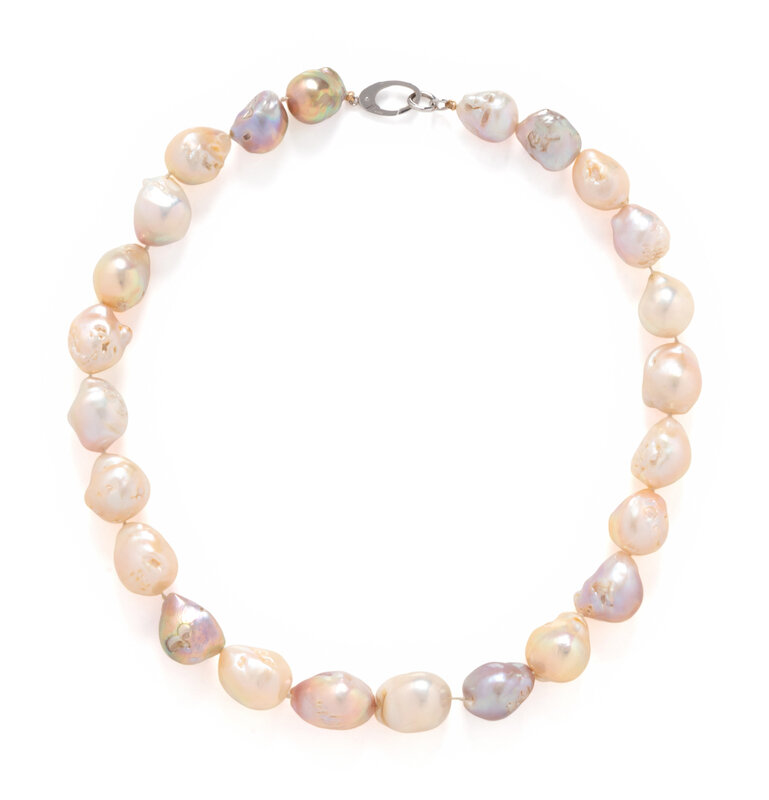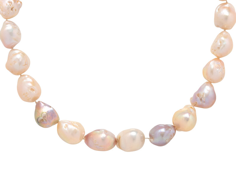 Baroque cultured pearls measuring approximately 12.75 - 16.90 mm, with an 18 karat white gold clasp. 19 1/2 inches long.