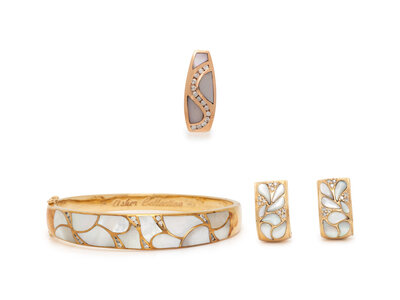 MOTHER-OF-PEARL AND DIAMOND BRACELET, EARRINGS, AND PENDANT