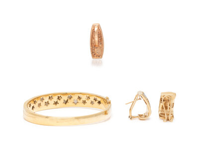 Including a pair of earrings, a slider pendant, and bangle bracelet, hinged with side clasp. Rose gold and 14 karat yellow gold. Earrings: 3/4 inch long. Pendant: 1 inch long. Bangle: 6 3/4 inches inner circumference.