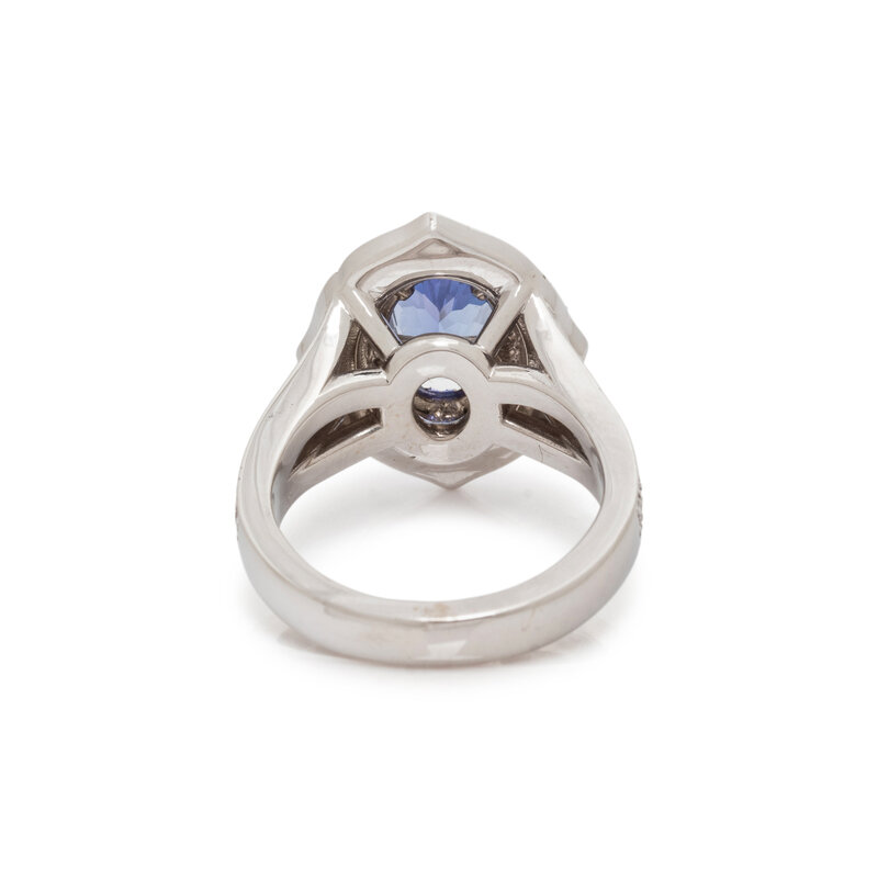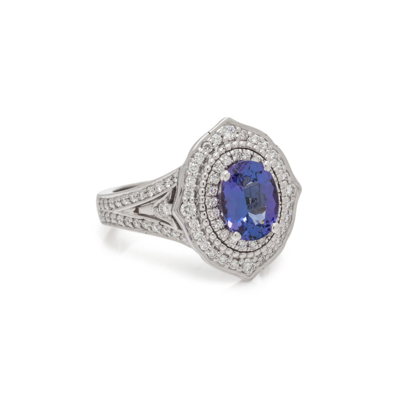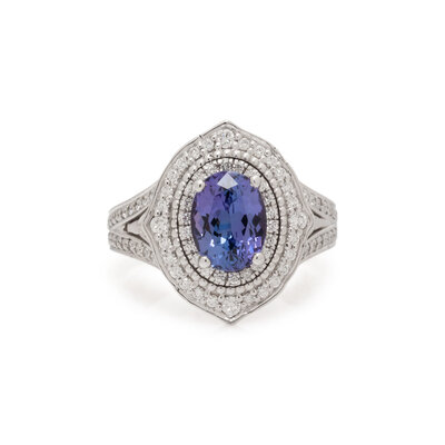 Oval tanzanite weighing approximately 1.50 carats by formula, and round diamonds weighing approximately 0.50 carat total. 14 karat white gold. Ring size 6 1/4.