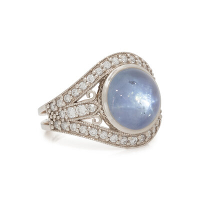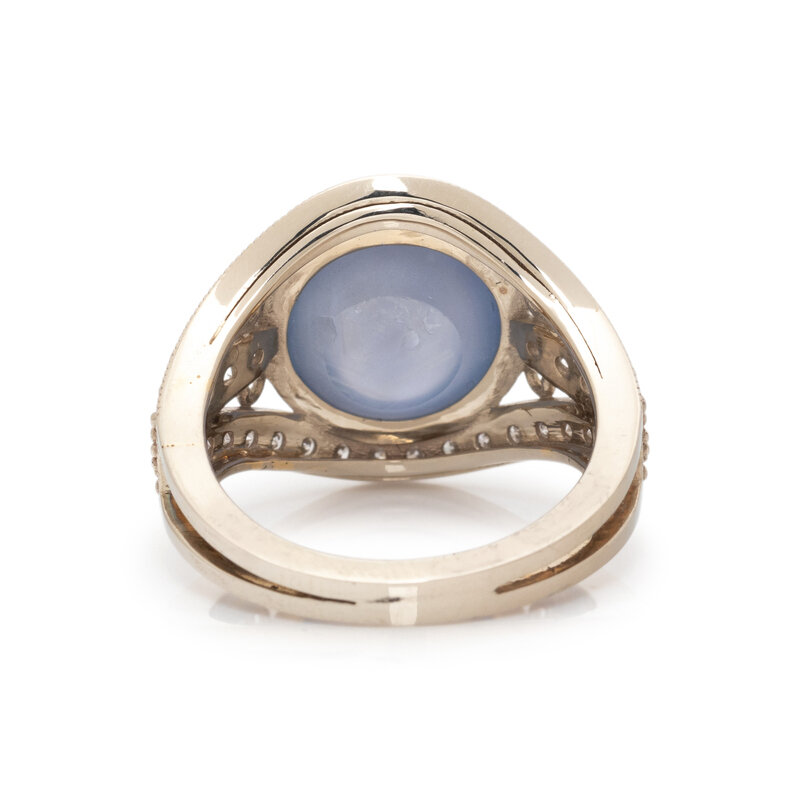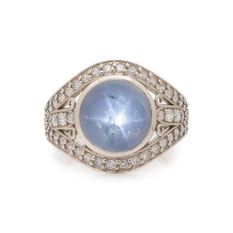 Round cabochon star sapphire weighing approximately 10.00 carats by formula and round diamonds. 14 karat white gold. Ring size 6 1/2.