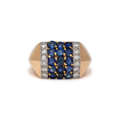 Round sapphires and round diamonds. 14 yellow gold. Ring size 4.