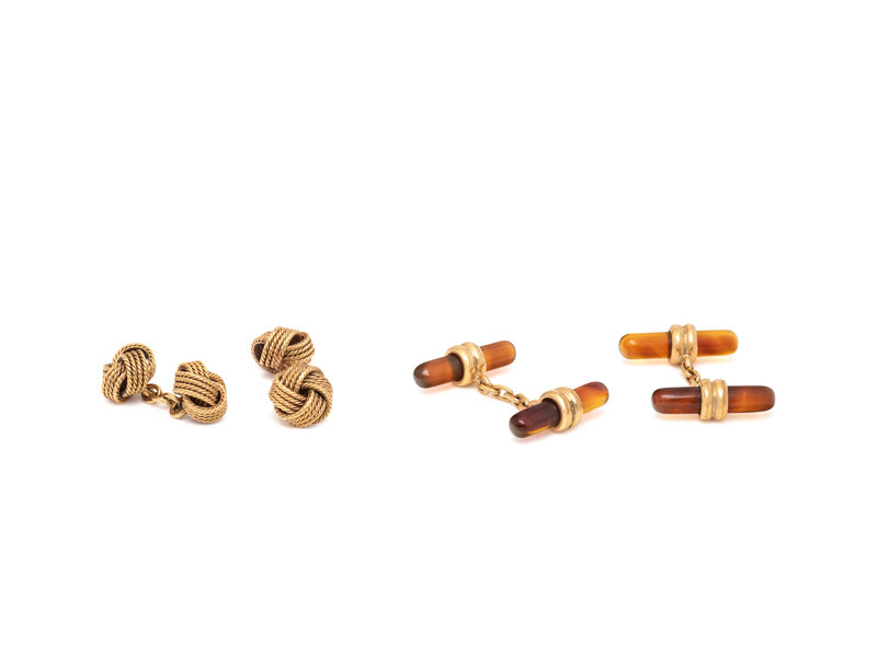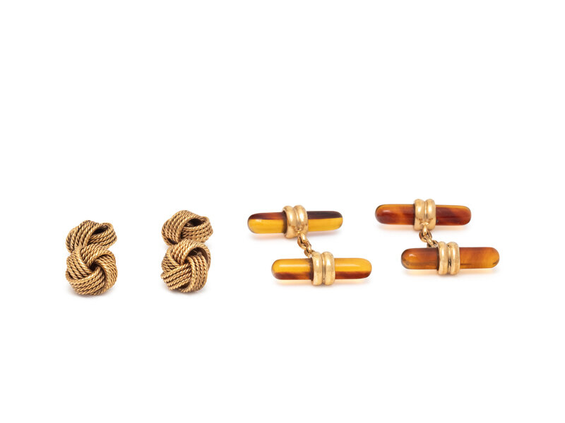 Including a pair of gold knot cufflinks and a pair set with amber batons. 18 karat yellow gold. 3/8 inch wide and 7/8 inch wide.