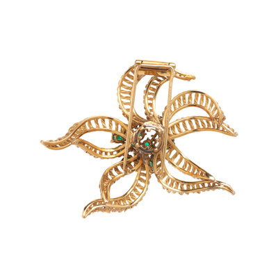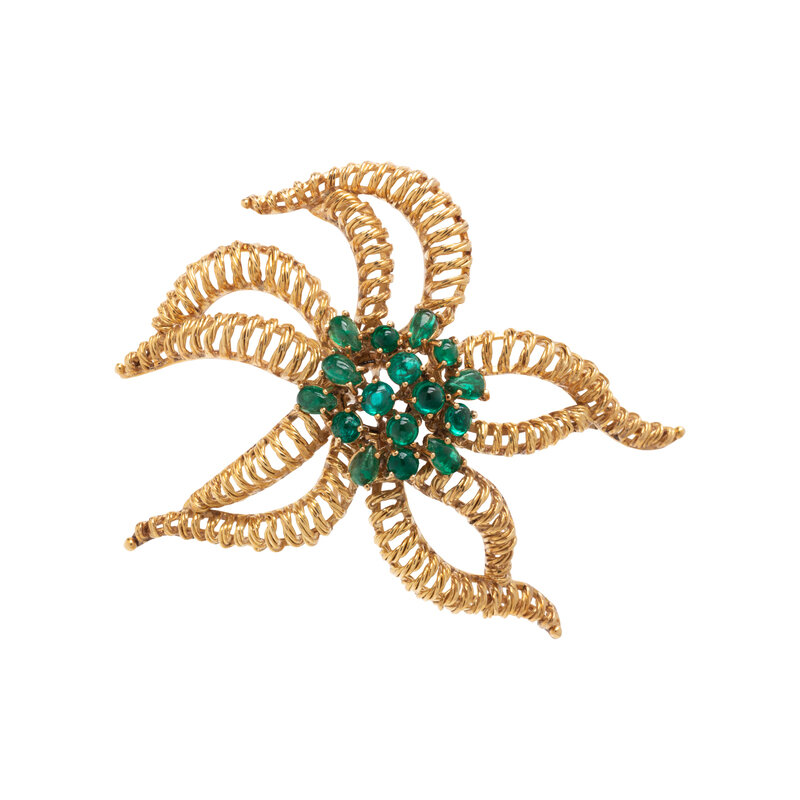 Round and pear shaped cabochon emeralds. 18 karat yellow gold. 2 1/2 inches wide.