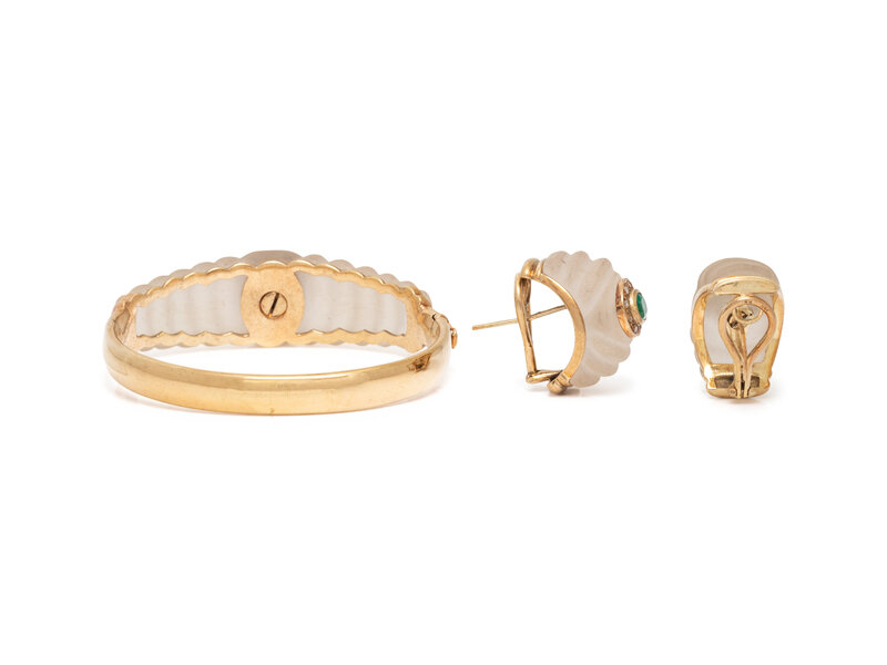 ROCK CRYSTAL QUARTZ, EMERALD, AND DIAMOND BRACELET AND EARRINGS
