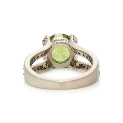 Round peridot measuring approximately 8.95 x 8.85 x 5.55 mm, and round diamonds. 14 karat white gold. Ring size 6.