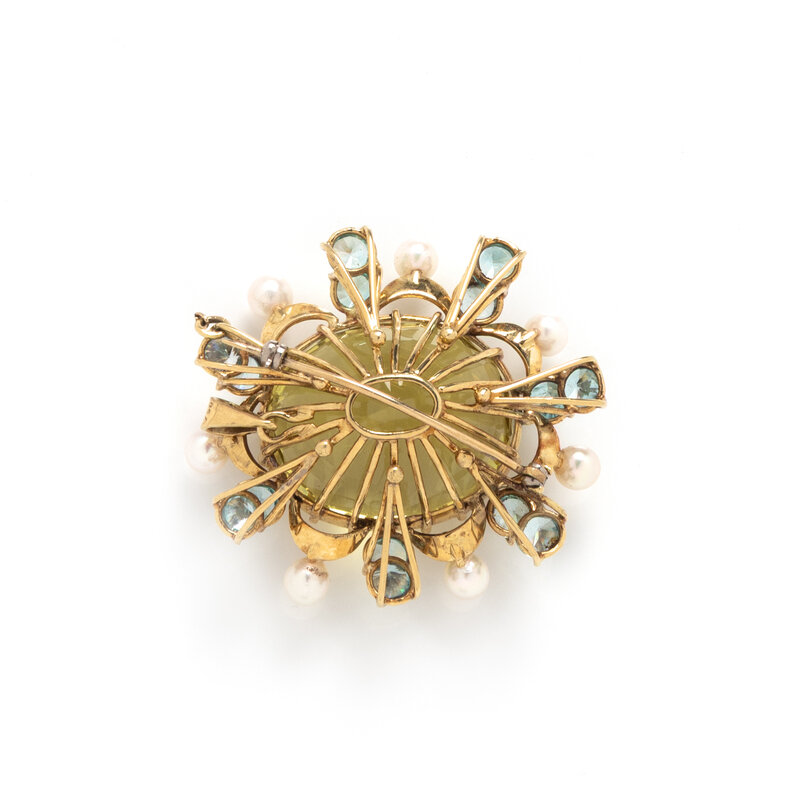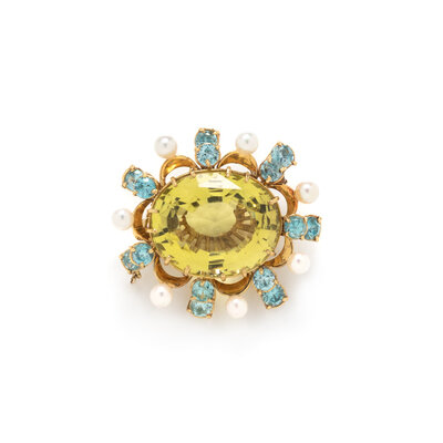 Oval lemon quartz measuring approximately 29.00 x 23.00 x 18.40 mm, round blue zircon, and cultured pearls measuring approximately 5.00 - 5.25 mm. Yellow gold. 1 7/8 x 1 3/4 inches.