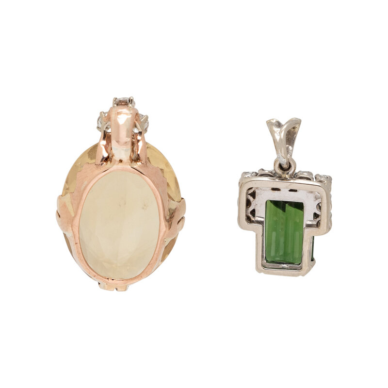 Including one set with an oval citrine measuring approximately 19.50 x 15.00 x 8.45 mm and round diamonds weighing approximately 0.25 carat total, and one set with an emerald cut green tourmaline measuring approximately 10.65 x 7.00 x 4.60 mm and round diamonds weighing approximately 0.25 carat total. Yellow and white gold. 1 inch long and 3/4 inch long.