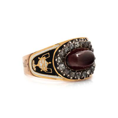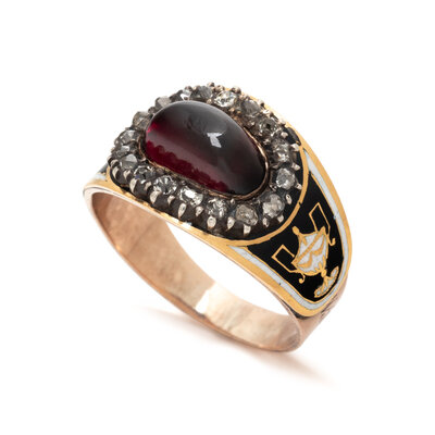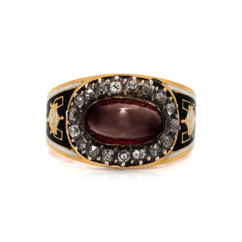 GEORGIAN, GARNET, ENAMEL, AND DIAMOND RING