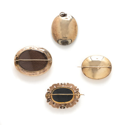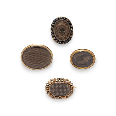 Including three brooches and a pendant, each set with a hair element. Low karat gold and yellow gold. 1 1/2 x 1 1/4 inches, 1 3/4 x 1 1/4 inches, 1 7/8 x 1 1/2 inches.