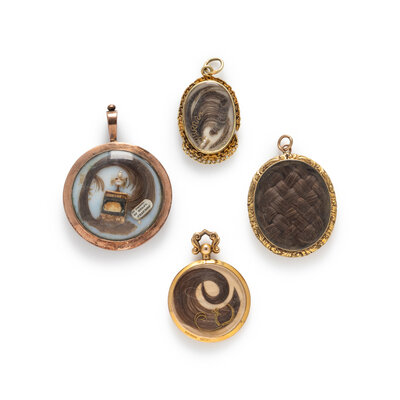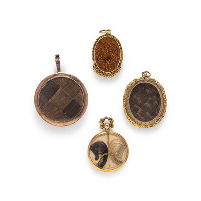 Including four pendants each set with a hair element, one set with goldstone glass on the reverse. Low karat gold and yellow gold. 1 1/2 - 1 7/8 inches long.