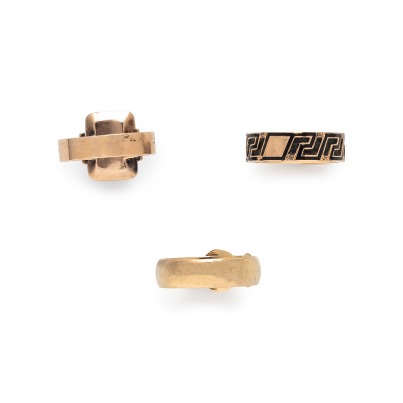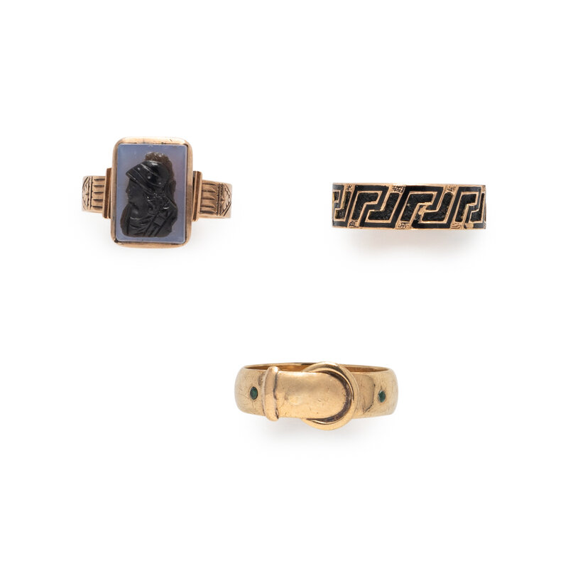 Including a ring with a hardstone cameo, a ring set with green glass stones, and a mourning ring with hair and black enamel. Low karat gold and yellow gold. Ring sizes 10, 10 1/2, and 8 3/4.