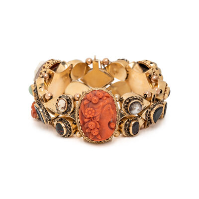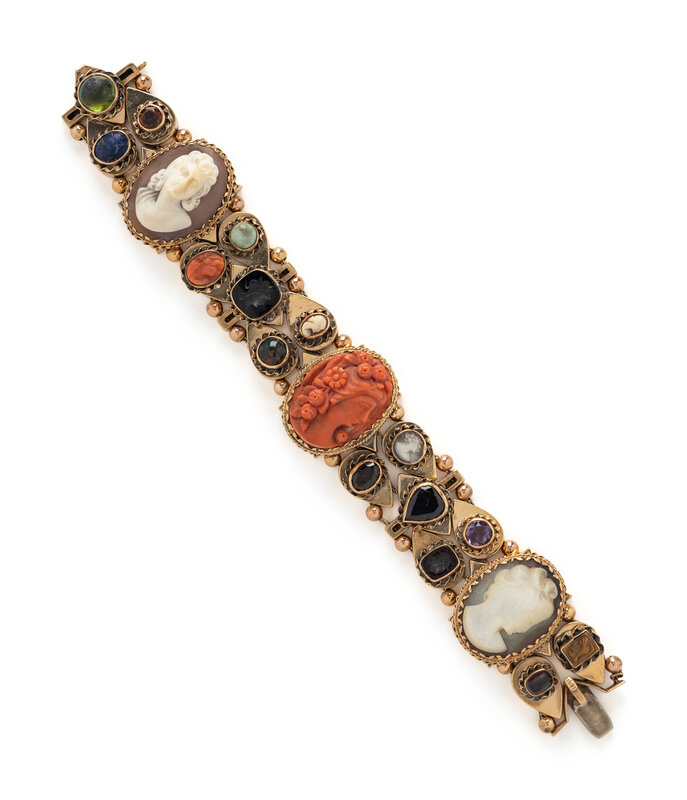 Including three large cameos, lapis lazuli, coral, amethyst, mother-of-pearl, tiger's eye, citrine, blood stone, garnet, black onyx intaglio, carnelian intaglio, and jasper. 14 karat yellow gold. 7 inches long, 1 1/8 inch wide.