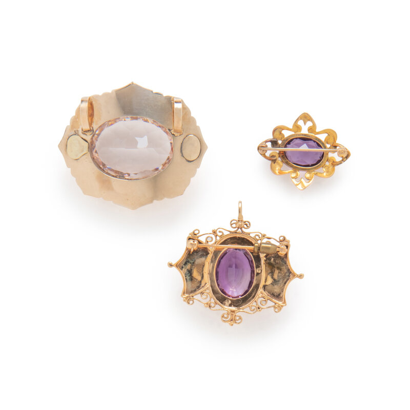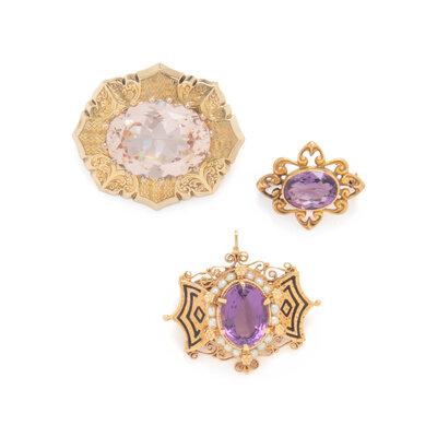 Consisting of three brooches, one set with an oval amethyst, one set with an oval amethyst with seed pearl and black enamel detail, and one set with an oval pink glass. Yellow gold. 1 inch - 1 3/4 inches wide.