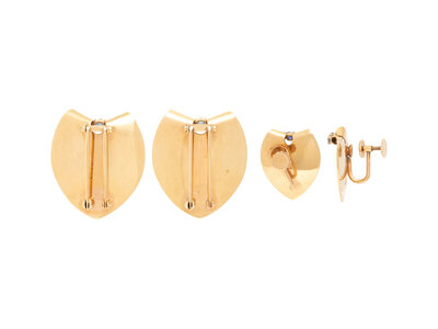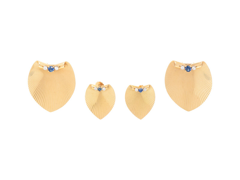 Two dress clips and a pair of earrings, each set with round sapphires and diamonds. Yellow gold. Dress clips: 1 3/8 x 1 3/16 inches. Earrings: 1 inch long.
