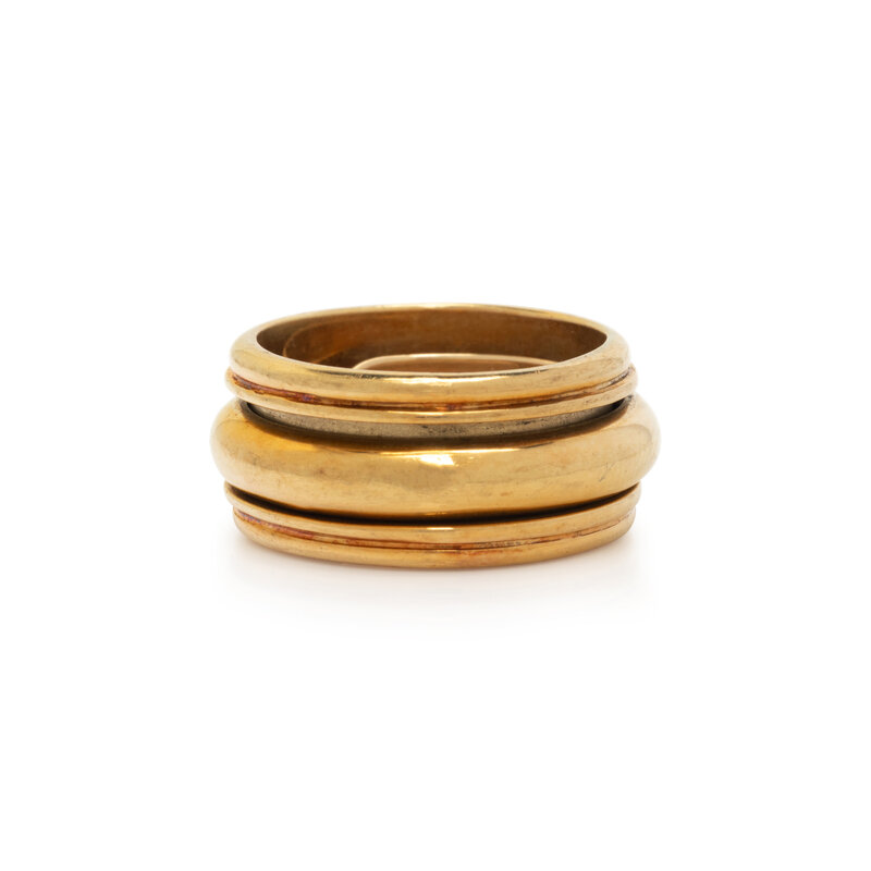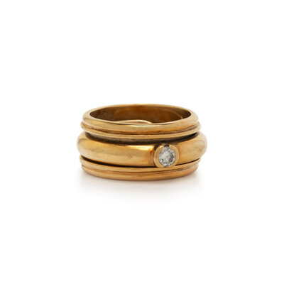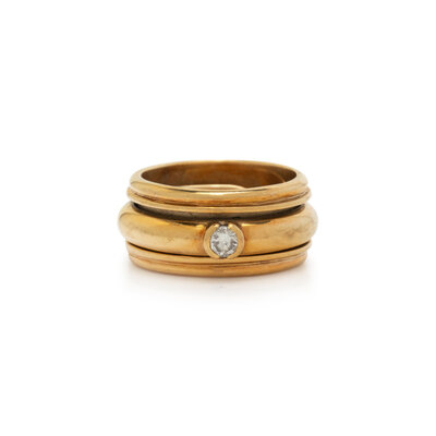 Round diamond weighing approximately 0.14 carat. 18 karat yellow gold. Ring size 6.