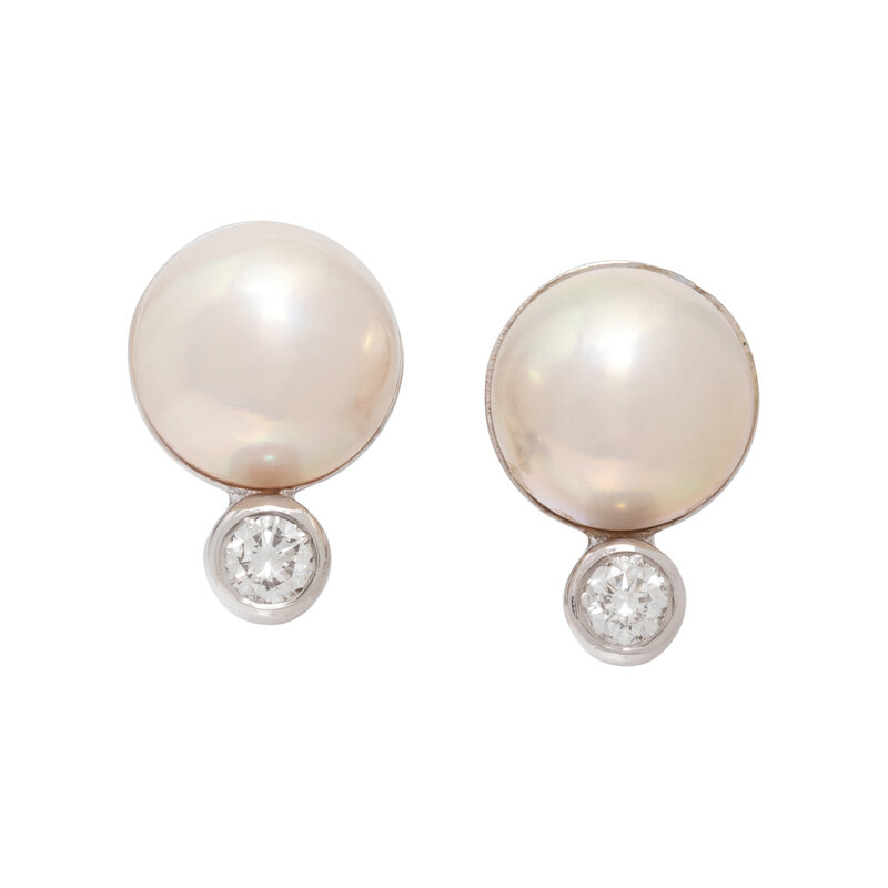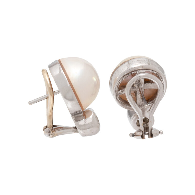 Mabé pearls measuring approximately 12.20 mm and round diamonds weighing approximately 0.50 carat total. 14 karat white gold. 3/4 inch long.