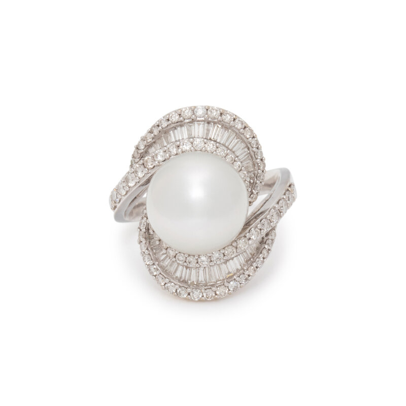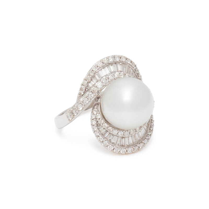 Cultured pearl measuring approximately 12.00 mm, and round and baguette cut diamonds weighing approximately 1.30 carats total. 18 karat white gold. Ring size 8 1/4.
