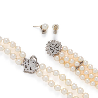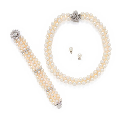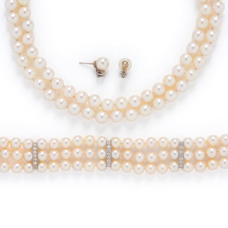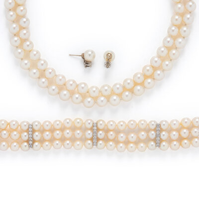 Including a bracelet with cultured pearls measuring approximately 7.00 - 7.50 mm and round and single cut diamonds weighing approximately 2.20 carats total, a necklace of cultured pearls measuring approximately 8.00 - 8.50 mm and single cut diamonds weighing approximately 0.50 carat total, and a pair of stud earrings set with cultured pearls measuring approximately 8.00 - 8.50 mm and round diamonds weighing approximately 0.35 carat total. White gold. Bracelet: 6 1/2 inches long. Necklace: 16 inches long. Earrings: 1/2 inch long.