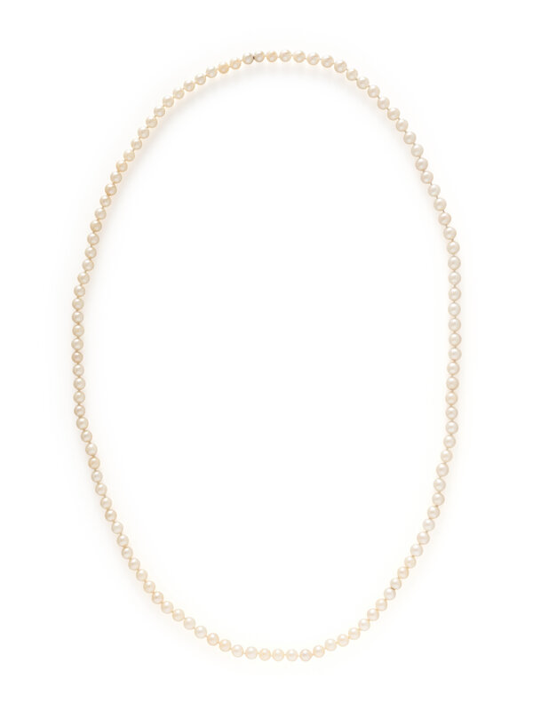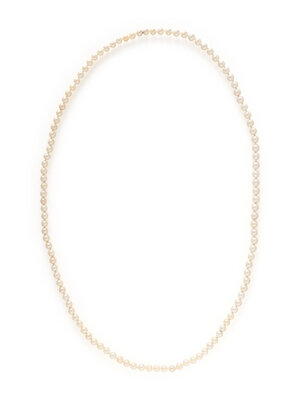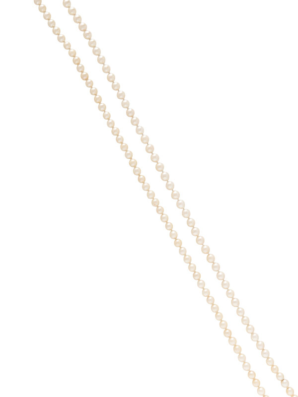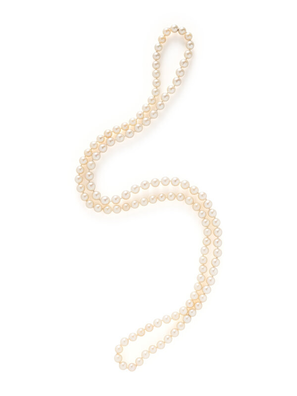104 cultured pearls measuring approximately 7.60 to 8.10 mm, with two hidden clasps. 17 inches and 23 1/4 inches long.