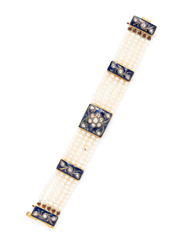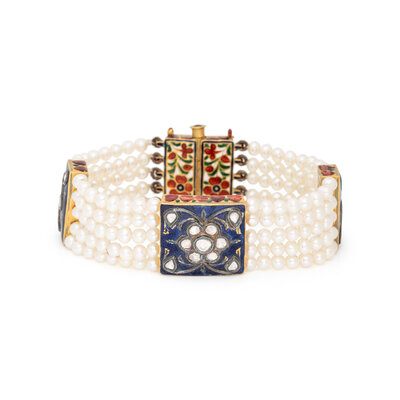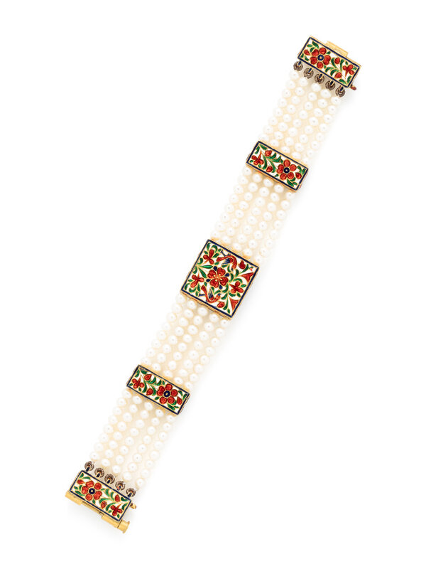 YELLOW GOLD, ENAMEL, DIAMOND, AND CULTURED PEARL MUGHAL-STYLE BRACELET