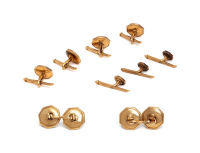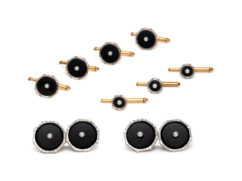 Including a pair of cufflinks, four buttons, and three studs, set with black onyx and seed pearls. 14 karat yellow gold and platinum. Cufflinks: 1/2 inch wide. Buttons: 7/16 inch wide. Studs: 1/4 inch wide.