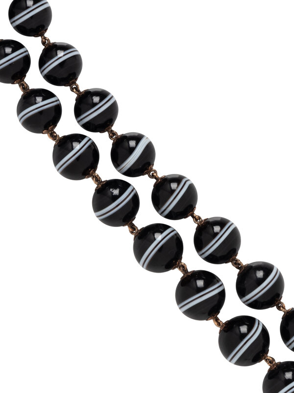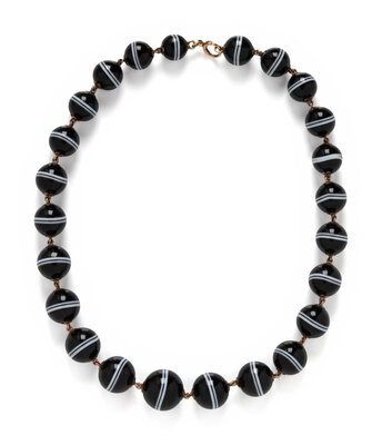 Graduating agate beads measuring approximately 15.20 - 22.90 mm. Low karat gold. 23 inches long.